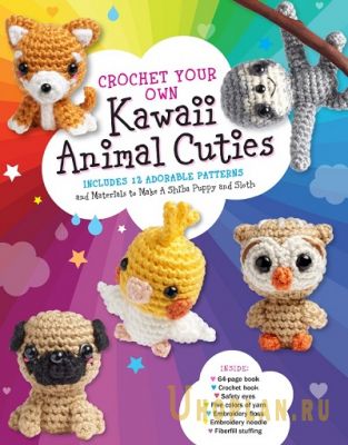 Книга по вязанию крючком игрушек. Kawaii Animal Cuties научит вас вязать крючком 12 самых симпатичных животных. Эти очаровательные животные такие прелестные, что их просто хочется связать всех! И теперь вы можете сделать это! Проекты содержит выкройки для создания 12 животных амигуруми с пошаговыми фотографиями, а также руководство по основным техникам вязания крючком и стежкам. Предлагаемые проекты - Щенок Шиба-ину; Выдры, держащиеся за руки; Детеныш тюленя; Енот; Лань; Щенок мопса; Нарвал; Коралла; Динозавр; Щенок корги; Сова; Жирный кот.